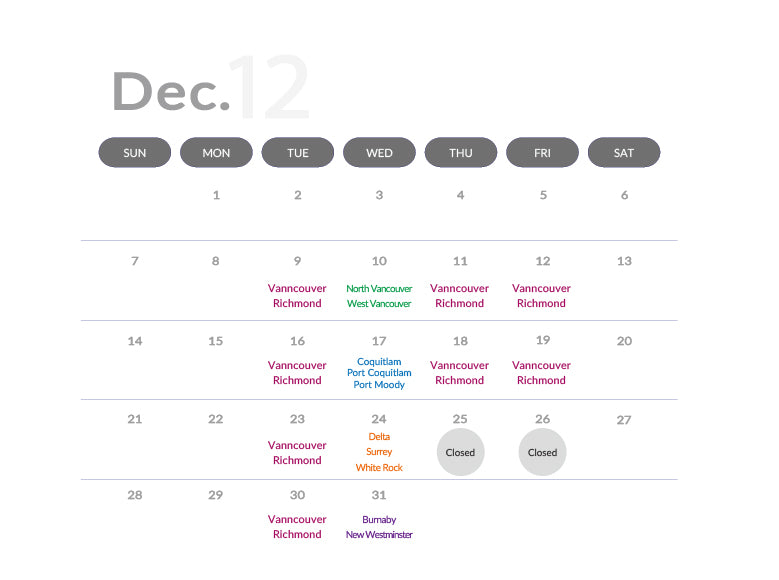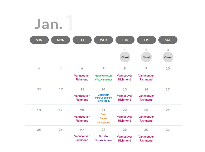 配送は曜日固定となっております。※年末年始は変更になる場合がございます。・・・・・・・・・火曜/木曜/金曜Vancouver&Richmond第一水曜日North Vancouver&West Vancouver第二水曜日Port Moody,Coquitlam&Port Coquitlam第三水曜日Delta,Surrey&White Rock第四水曜日Burnaby&New Westminster
